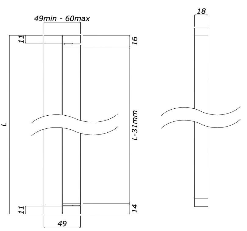 Dimensions hors tout du profil : 49mm x 18mm x 2500mm