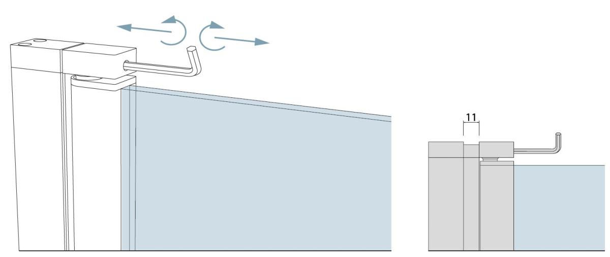 Fixez le profilé d'aplomb sur le mur, présentez le verre dans l'encoche, réglez puis serrez les mâchoires du profilé mobile